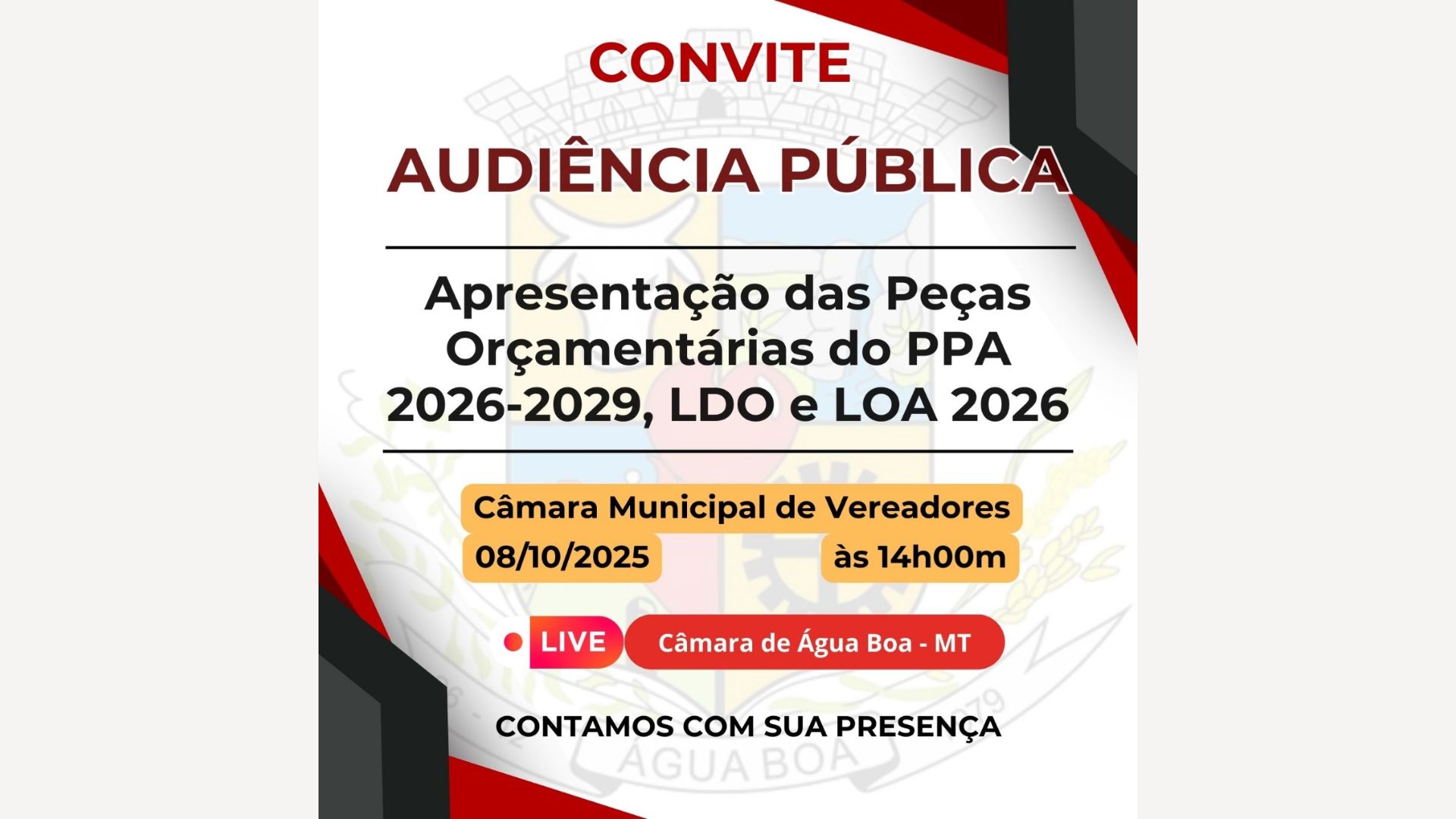 A Prefeitura Municipal de Água Boa convida toda a população para participar da Audiência Pública que apresentará as Peças Orçamentárias referentes ao exercício de 2026.