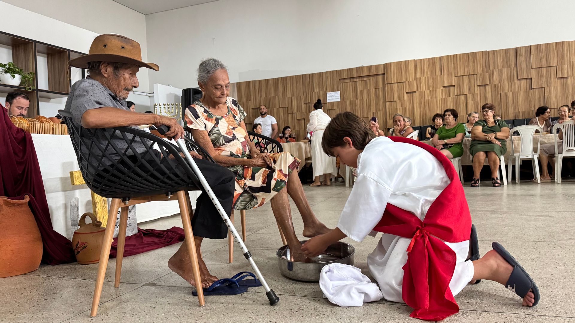 O encontro foi marcado pela encenação da tradicional cerimônia do Lava-Pés, que relembra o momento em que Jesus Cristo lavou os pés de seus discípulos durante a Última Ceia, gesto que simboliza humildade, serviço ao próximo e amor fraterno, marcando o início do Tríduo Pascal.