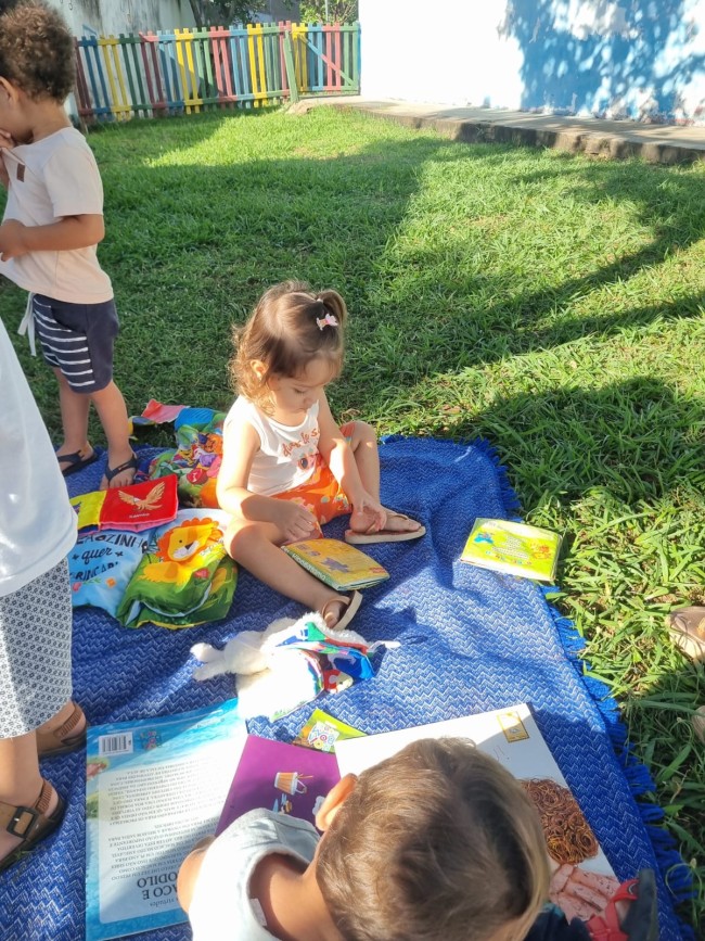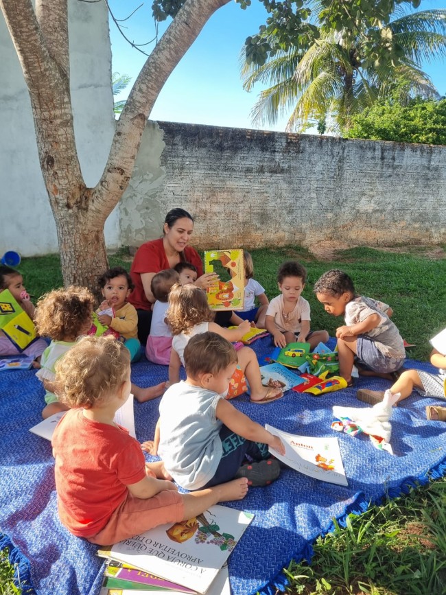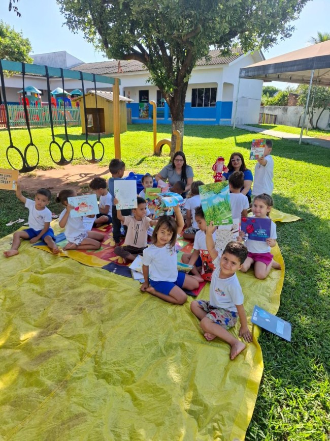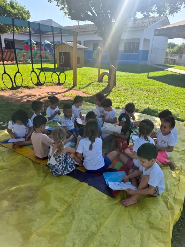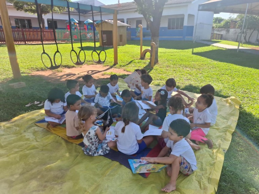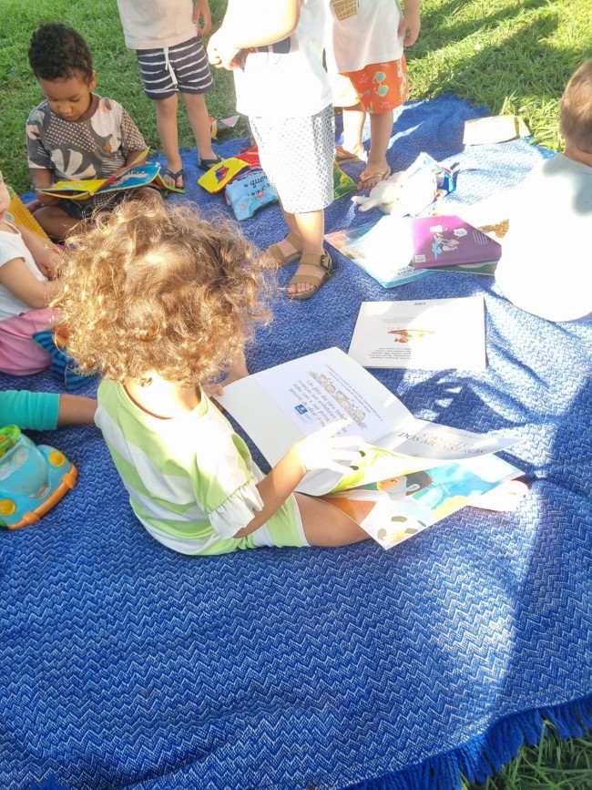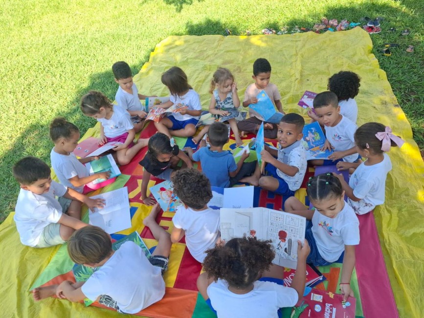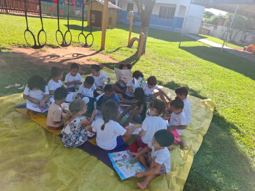 A programação contou ainda com momentos de leitura coletiva no jardim da escola, proporcionando um ambiente acolhedor e diferente da sala de aula tradicional.