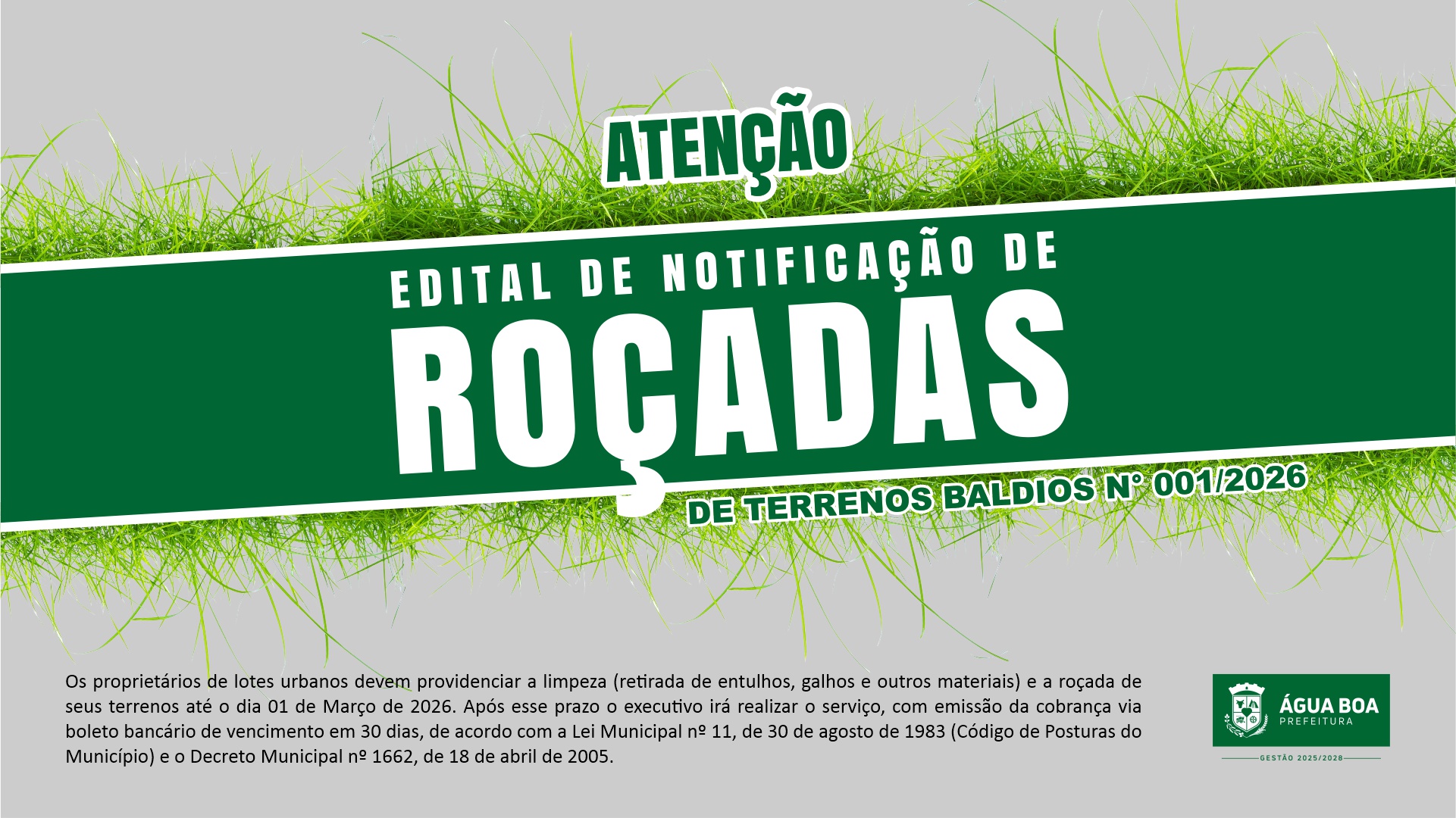 A Prefeitura de Água Boa informa que encerra no fim de fevereiro o prazo para a limpeza de terrenos baldios localizados no perímetro urbano do município.