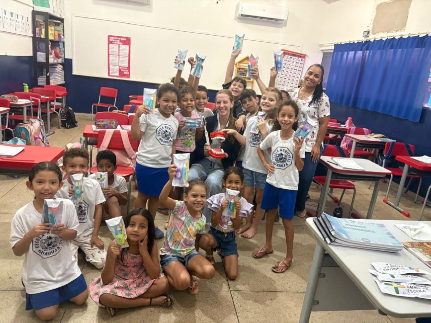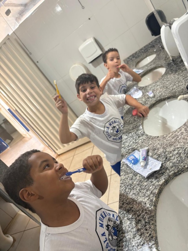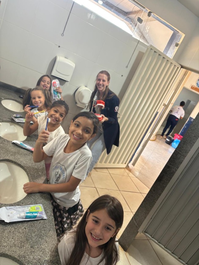 Nesta quarta-feira (20), a equipe de saúde bucal da Estratégia Saúde da Família (ESF) Guarujá realizou mais uma ação de escovação supervisionada com a entrega de kits de higiene bucal para os alunos da Escola Municipal Guarujá. A atividade foi conduzida pela cirurgiã-dentista Janine Sherer e pela auxiliar em saúde bucal Ana Flávia.