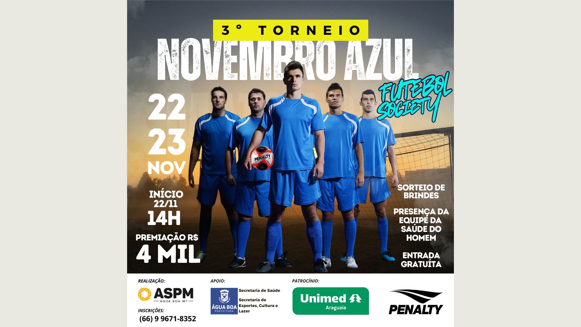 A Prefeitura de Água Boa convida todos os homens para participar do 3º Torneio ASPM de Futebol Society, em apoio ao Novembro Azul, mês de combate ao câncer de próstata. O evento vai acontecer na Associação dos Servidores Públicos Municipais (ASPM), nos dias 22 e 23 de novembro, sábado e domingo, com início às 14 horas e premiação total de R$ 4 mil.