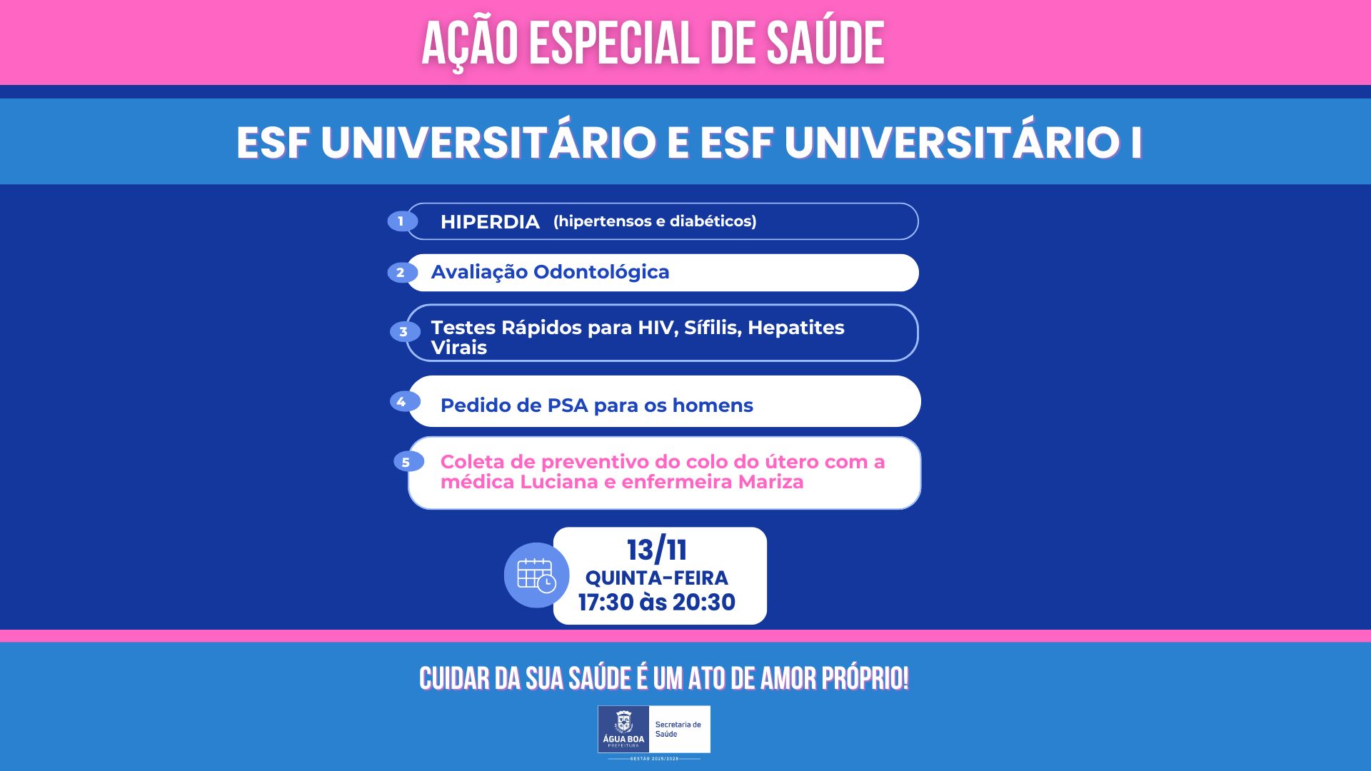 Pensando em oferecer mais oportunidades de cuidado à população que trabalha durante o dia, as equipes das ESFs Universitário e Universitário 1 realizam nesta quinta-feira, 13 de novembro, uma ação especial de saúde voltada para homens, mulheres, diabéticos e hipertensos.