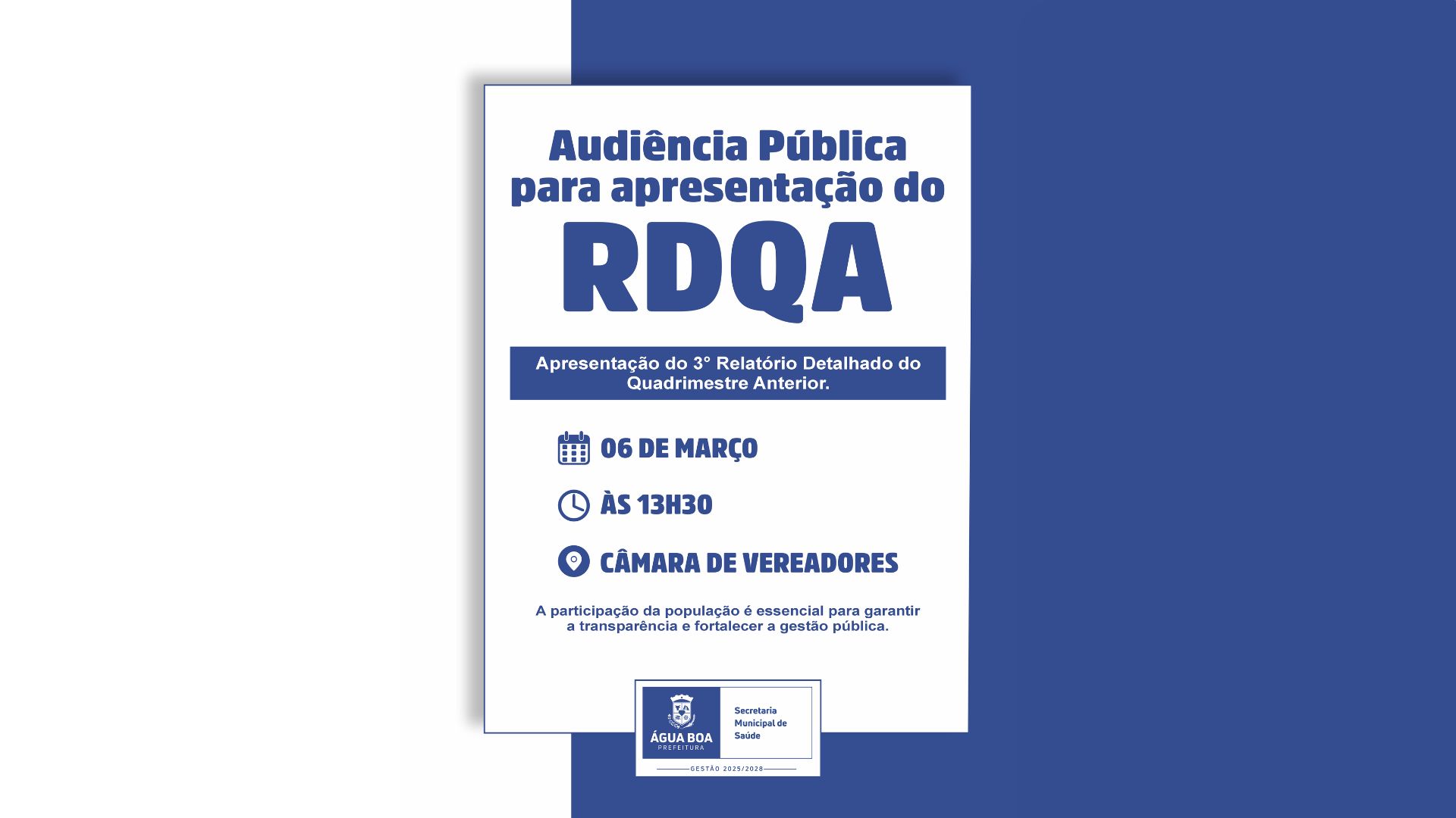 A Secretaria Municipal de Saúde de Água Boa convida toda a população para participar da Audiência Pública de apresentação do 3º Relatório Detalhado do Quadrimestre Anterior (RDQA).