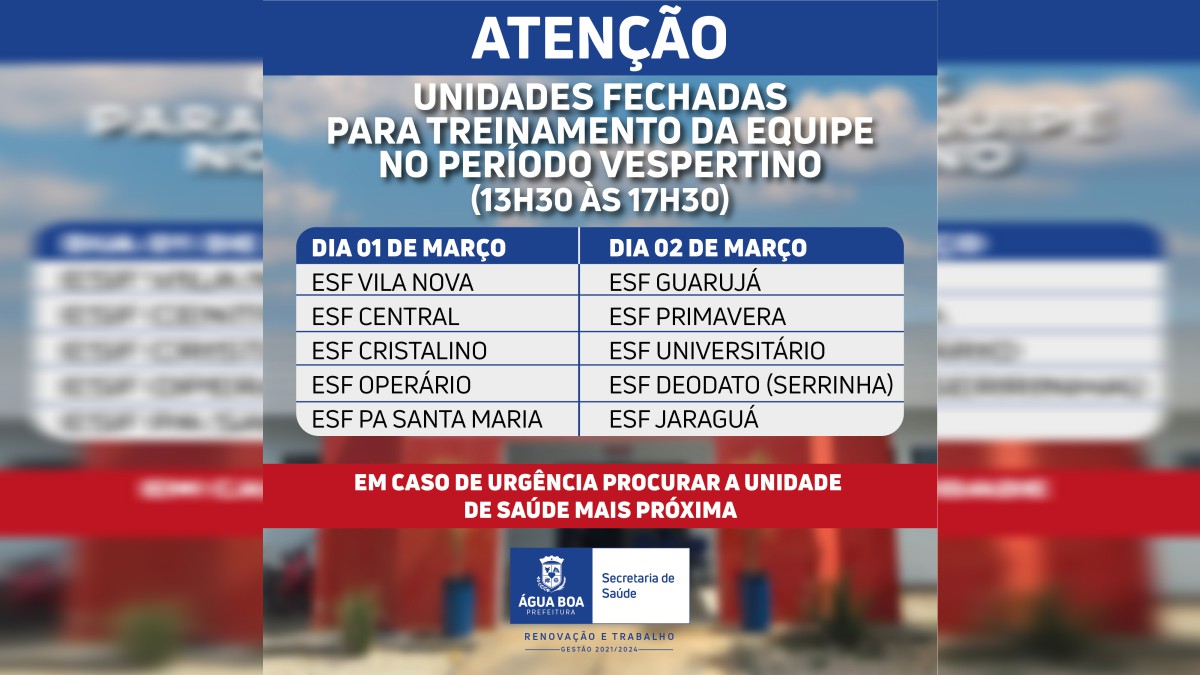 Confira: ESFs fecham para treinamento na quarta (1) e quinta-feira (2) Cristiane Cândido | Ascom Saúde 27 Fevereiro 2023